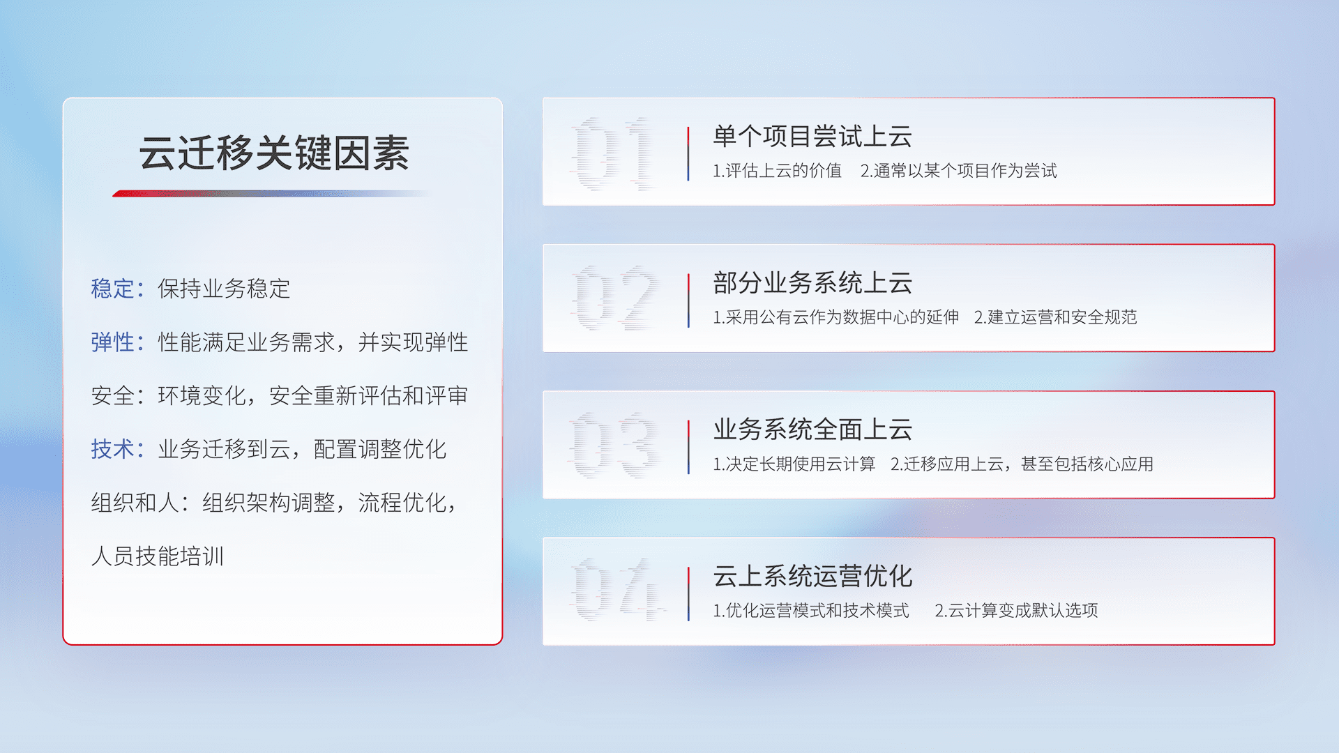 结合实际业务,,从规划设计、、、云平台选型、、、、云原生改造、、、数据迁移、、、集成交付,,,,迁移全过程为客户识别最佳上云路径,,,做好风险识别管理,,,,设计网络架构、、、身份权限、、、安全审计合规、、、、操作审计、、、日志审计、、、监控告警策略、、多站点容灾设计等,,对云上基础设施进行整体规划,,,提升IT治理水平,,,,以满足弹性、、高可用、、、高性能的需求。。。