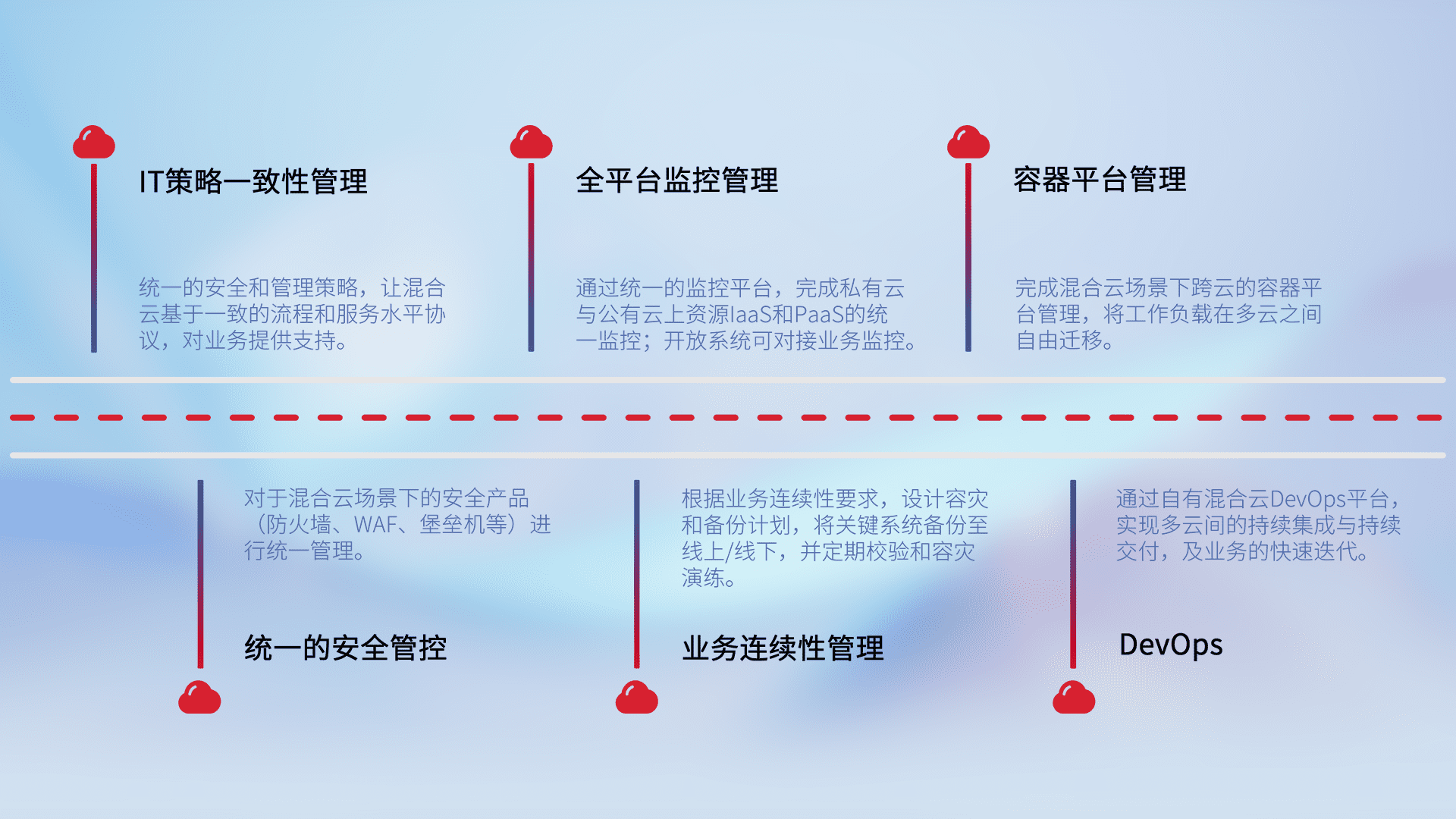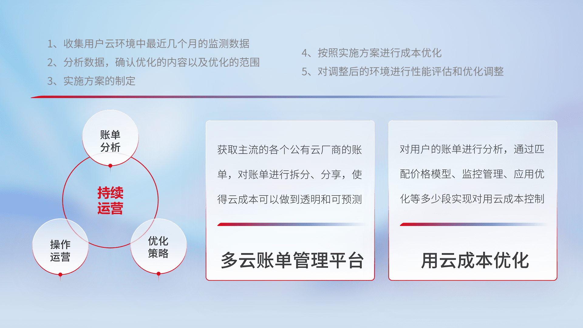通过多云纳管,,,以统一的资源数据模型把客户的云资源进行抽象和封装,,,,进而实现对多云资源的统一操作,,,保障云资源管理的可靠性、、稳定性与可用性。。。量身定制化运维内容,,,配置、、开发运维、、补丁管理、、、备份、、、、监控、、认证和访问管理、、、、审计和日常巡检等,,保障在用云过程中的可靠度,,稳定度以及高可用率。。。