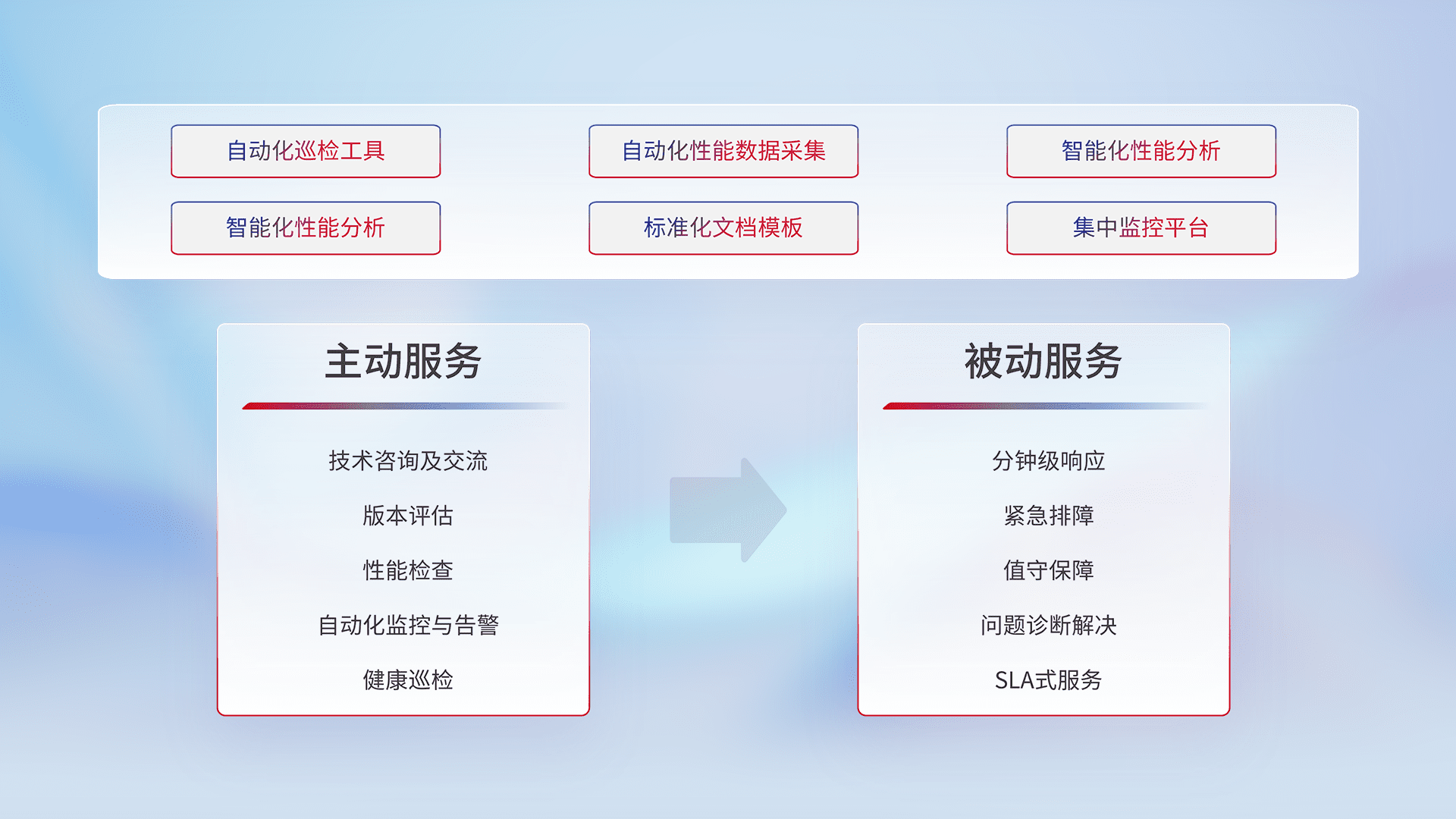智能化工具和标准化文档,,保障服务质量,,,提供主动服务(包含技术咨询、、、、版本评估、、、、性能检查、、自动化监控与告警、、健康巡检)和被动服务包含(分钟级响应、、、紧急排障、、、值守保障、、问题诊断解决、、、、SLA服务)。。
