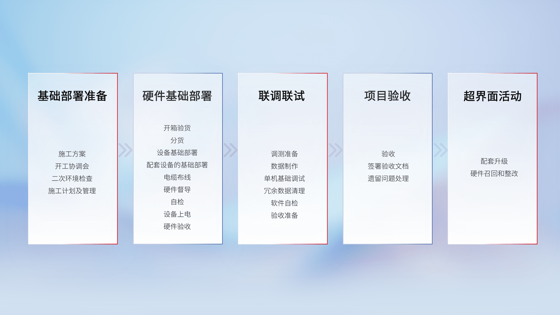 从基础部署准备、、硬件基础部署、、、、联调联试、、、项目验收、、、、越界面活动的全过程可追溯,,,保证施工质量和进度。。。。